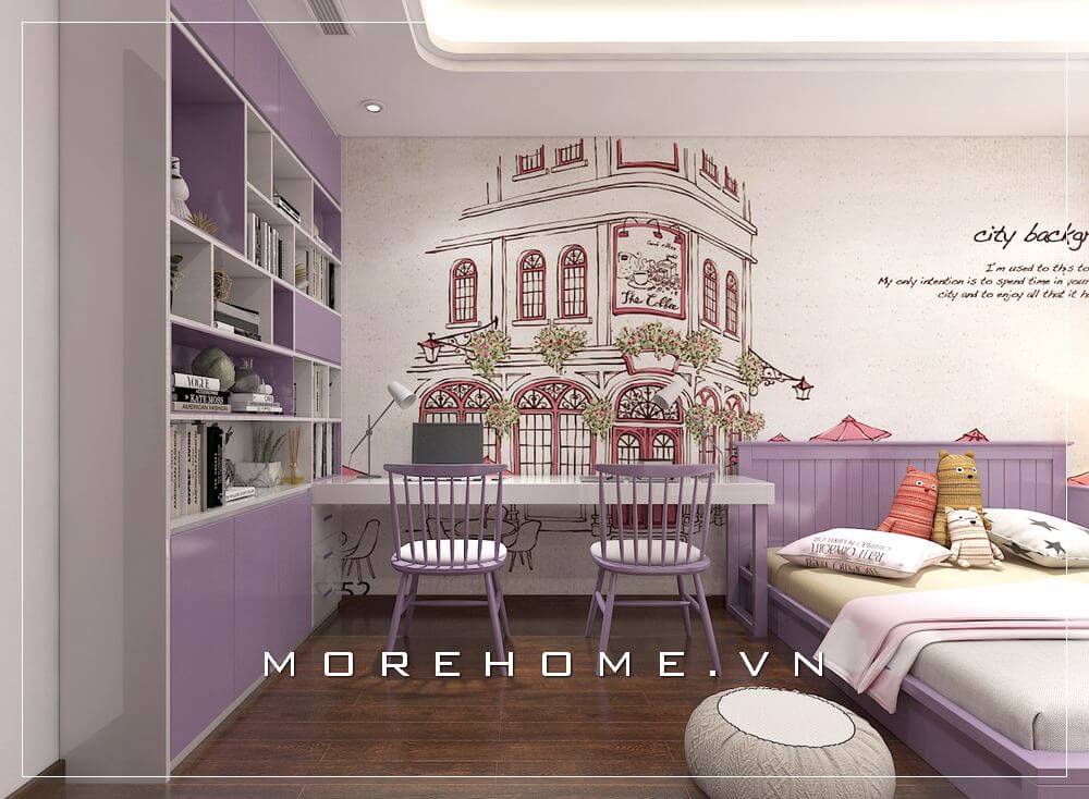 Thiết kế nội thất phòng ngủ bé gái phong cách hiện đại, sinh động với mẫu đồ nội thất bằng gỗ An cường sử dụng màu tím tạo cảm giác nhẹ nhàng và lãng mạn cho nhà phố